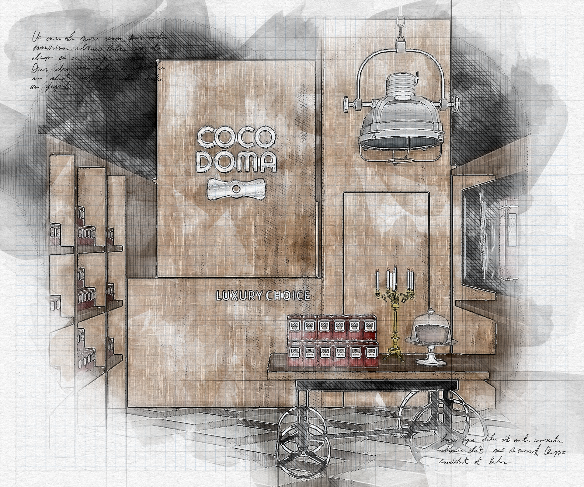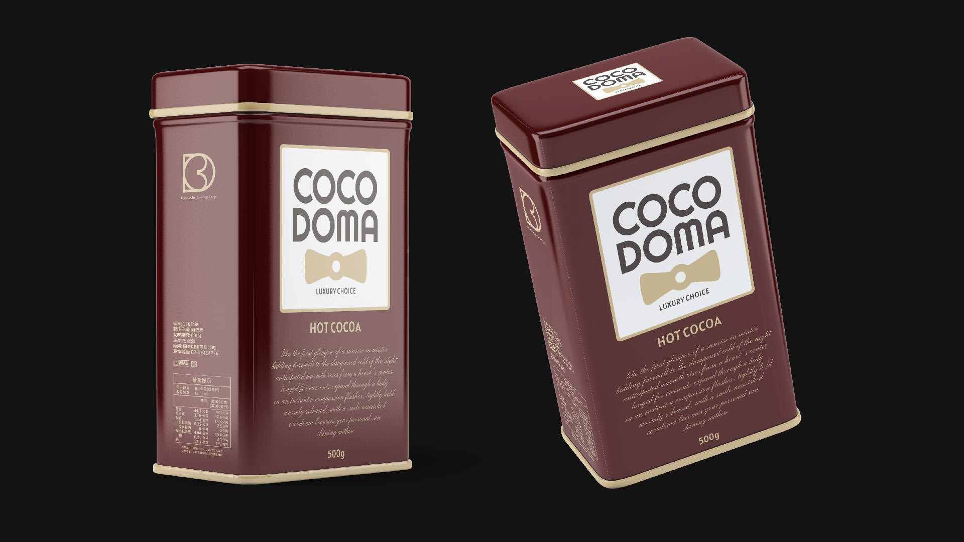 COCODOMA 可可多瑪,層次豐富、撫慰人心的可可飲品,一如紳士般正直、品味、溫暖可靠是品牌的核心。設計包含品牌視覺、可可粉包裝、罐裝飲品包裝、攤車、旗艦店設計。